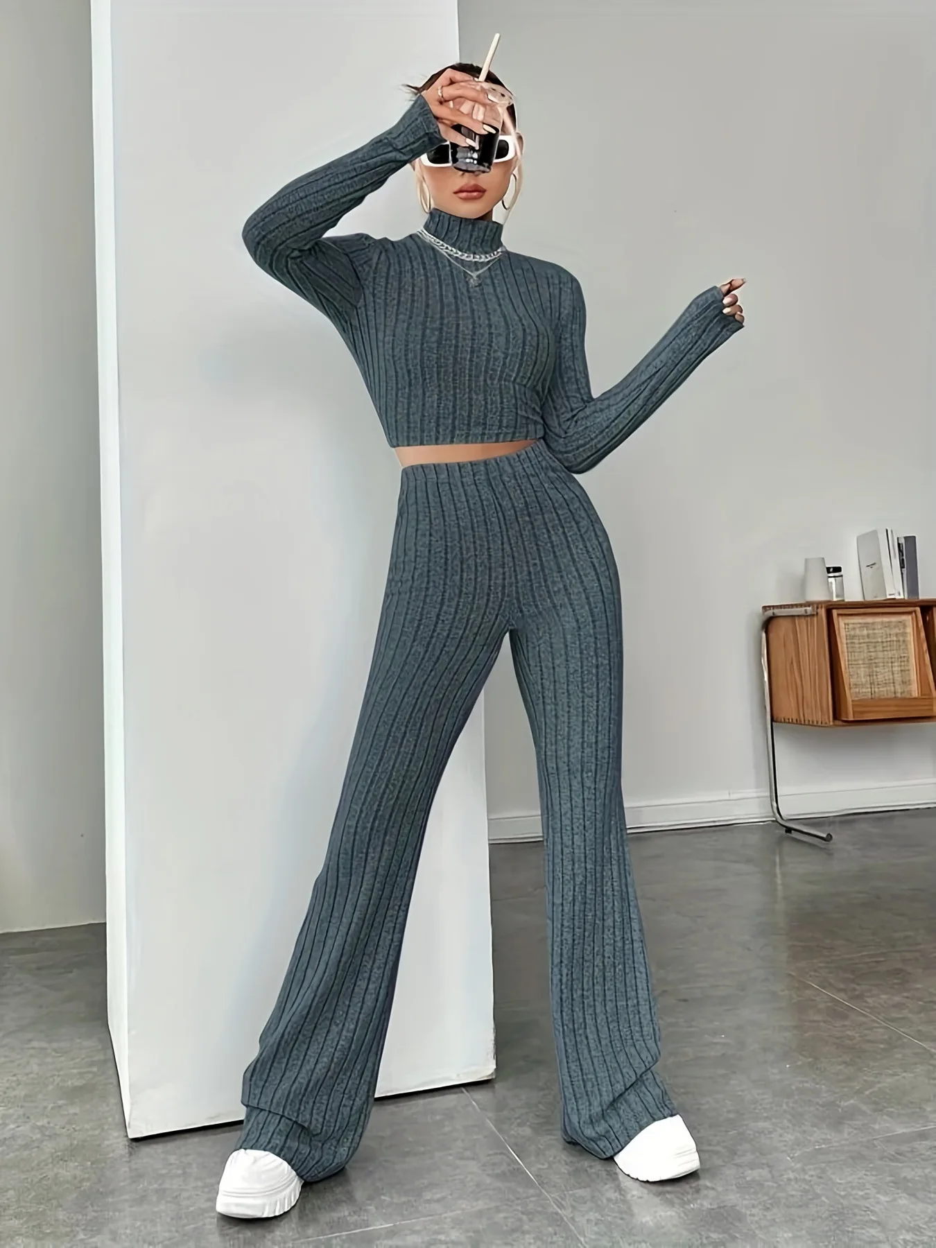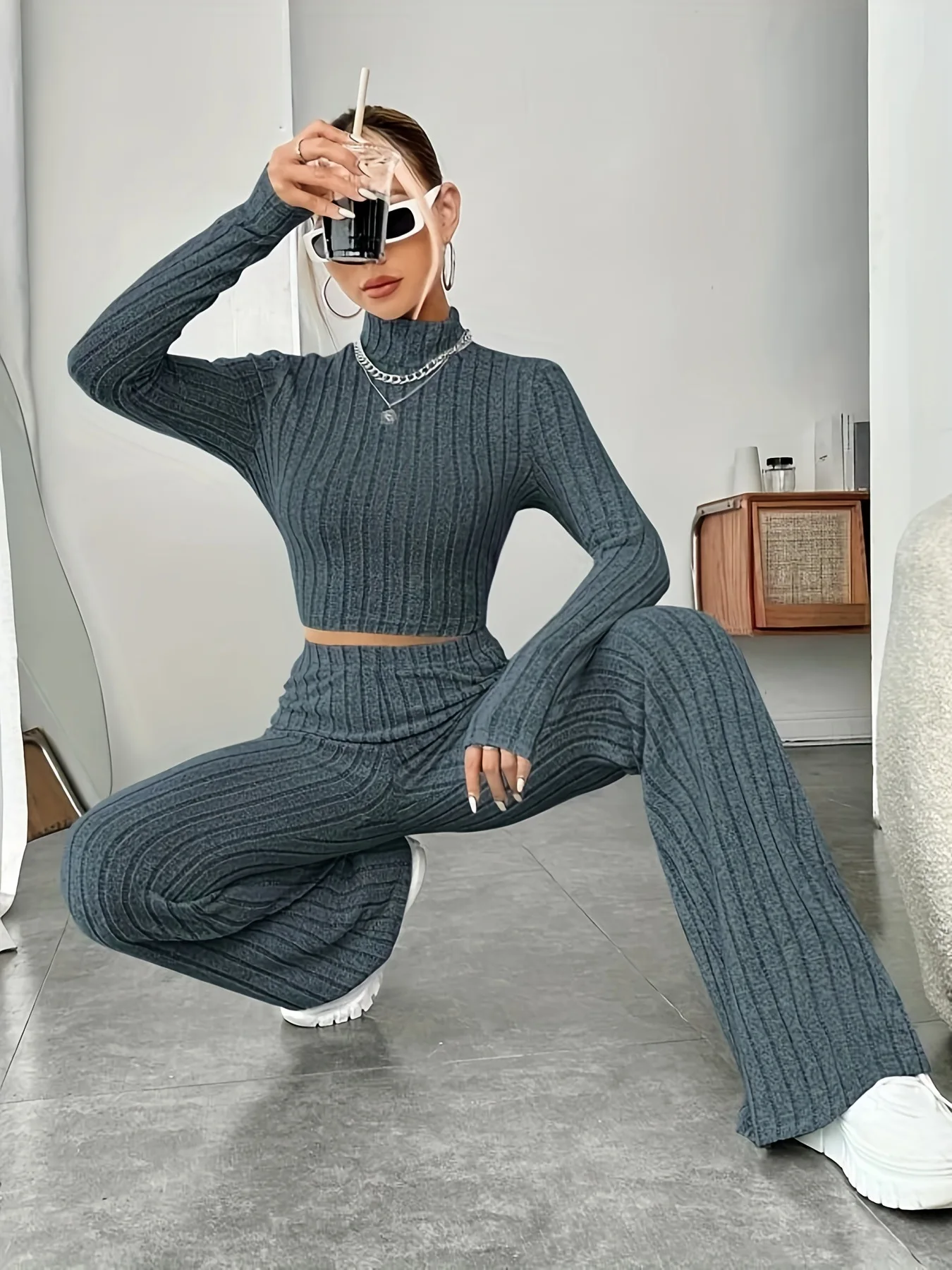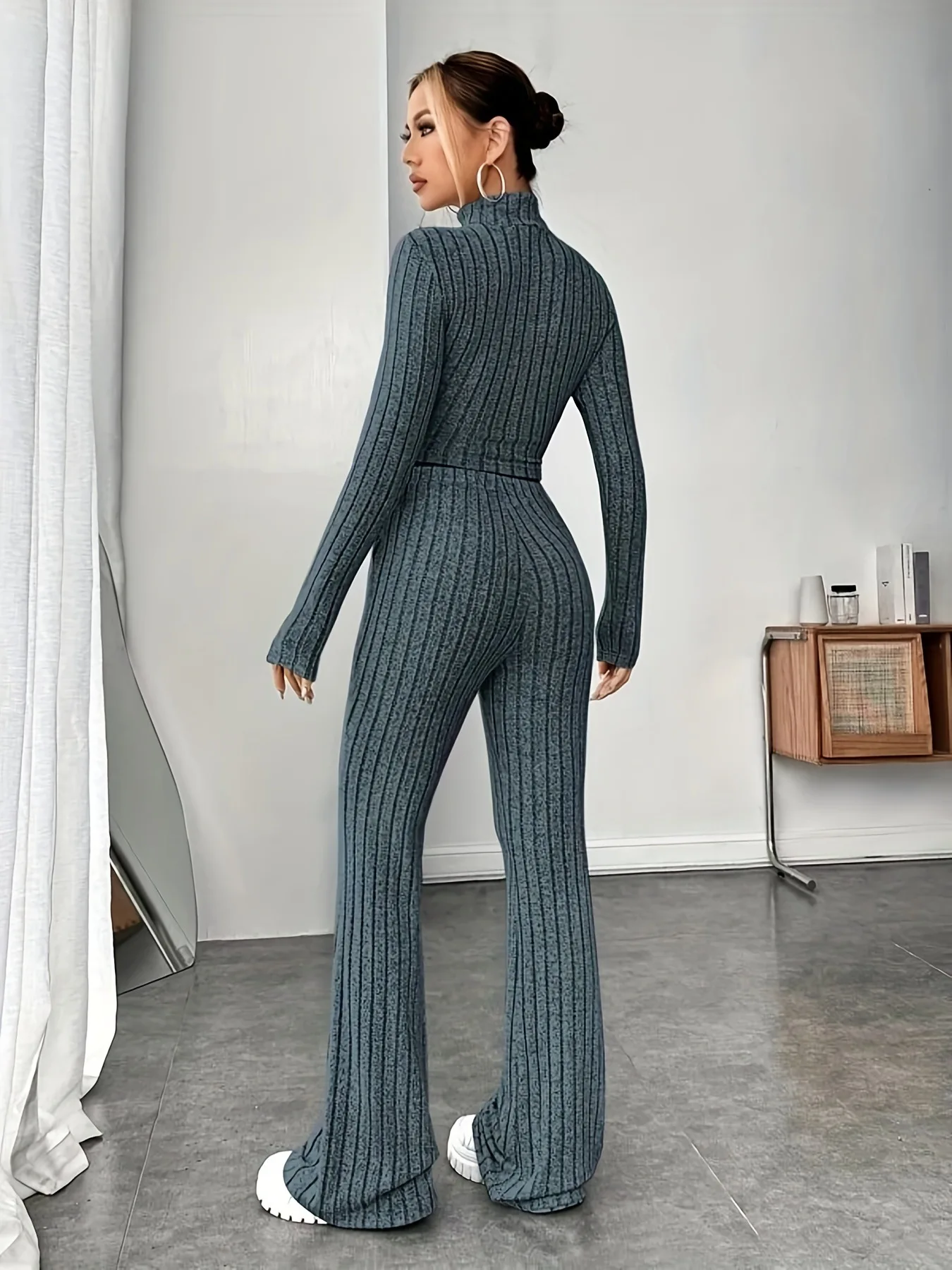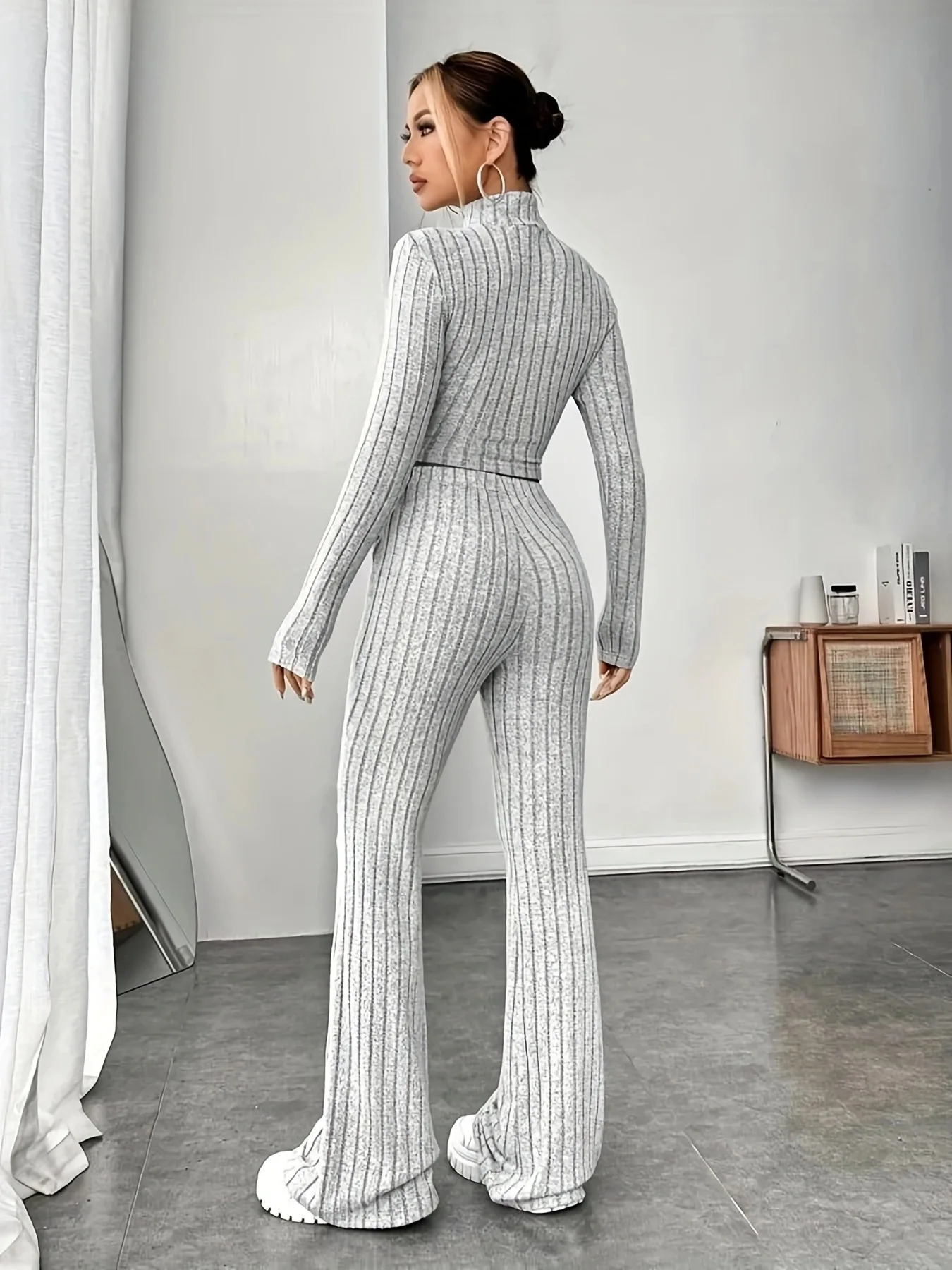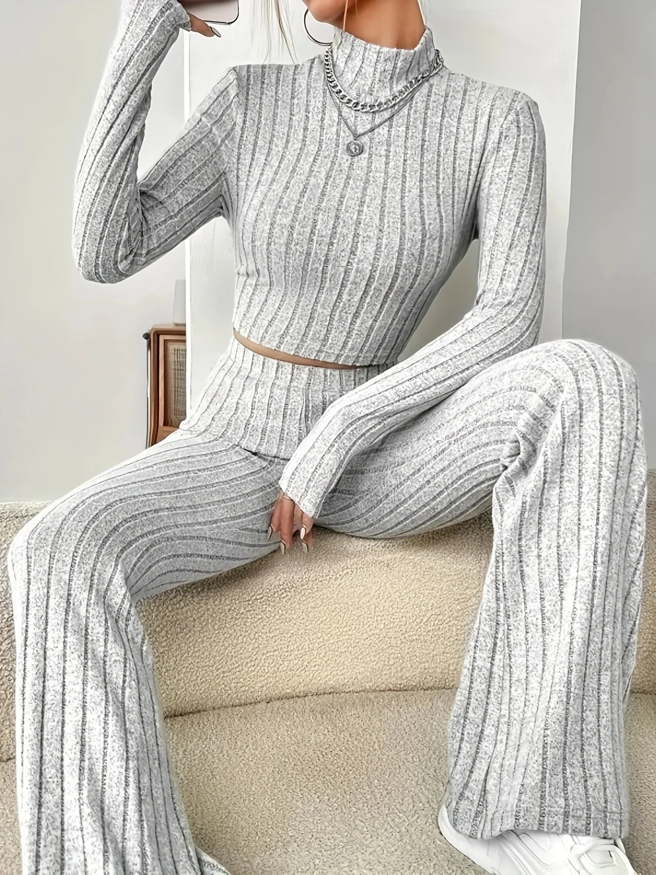 Women's Solid Color Knit Suit Spring Summer Stand Collar Striped Long Sleeve Pullover Top And Pants Streetwear Two Piece Set